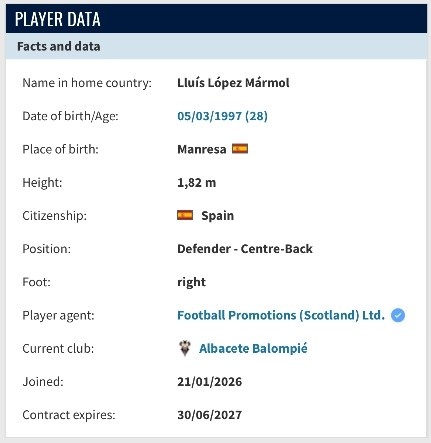 在路易斯·洛佩斯个人的德转页面中显示,他已经与1月21日加盟阿尔瓦赛特,合同有效期至2027年6月30日,转会方式为自由身。